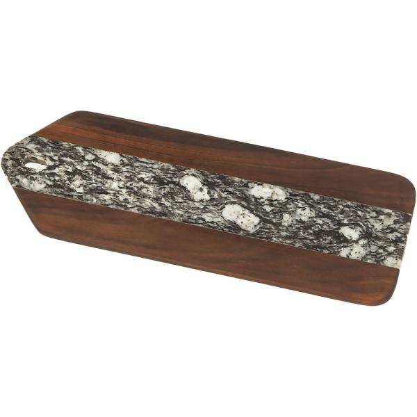 Acacia wood board with marble center makes a striking serving board for cheeses, appetizers or desserts. The carbonized finish adds a warm and beautiful caramelized hue to the wood.